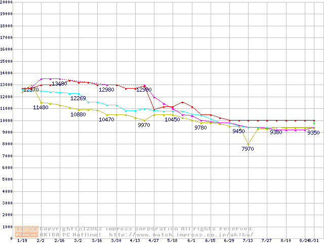 | [↑前グラフ]: | HDD 40GB~50GB未満(5400rpmクラス)の最安値推移 |