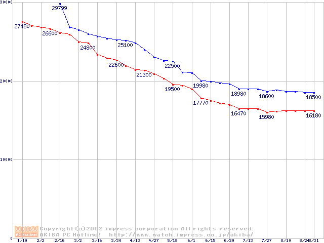 | [↓次グラフ]: | HDD 20GB~30GB未満(7200rpmクラス)の最安値推移 |