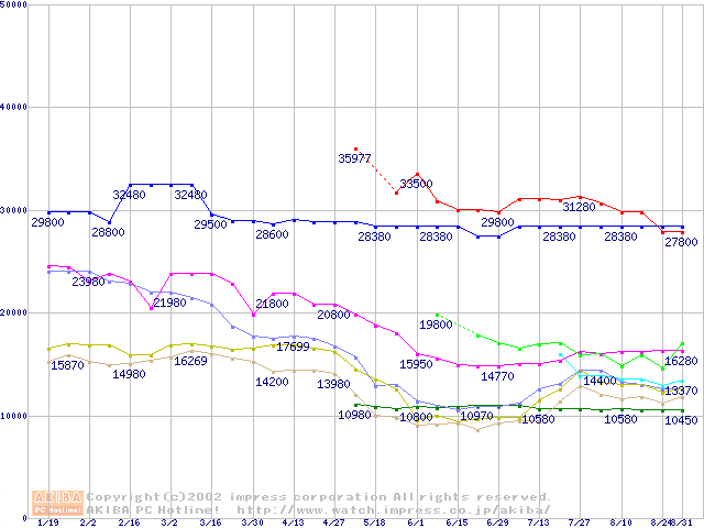 メモリ主要製品(最安値1万円以上)の最安値推移