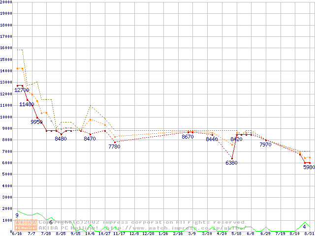 Socket A (Thunderbird,PGA,FSB 200MHz,L2 256KB)の最安値推移