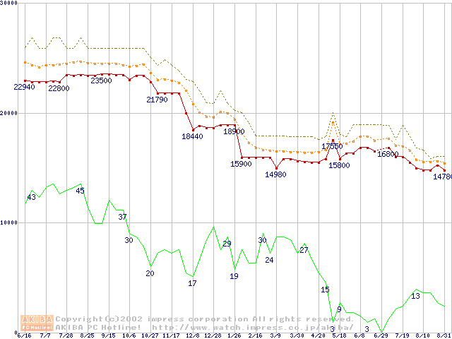 Socket 370 (FC-PGA,FSB 133MHz,L2 256KB)の最安値推移