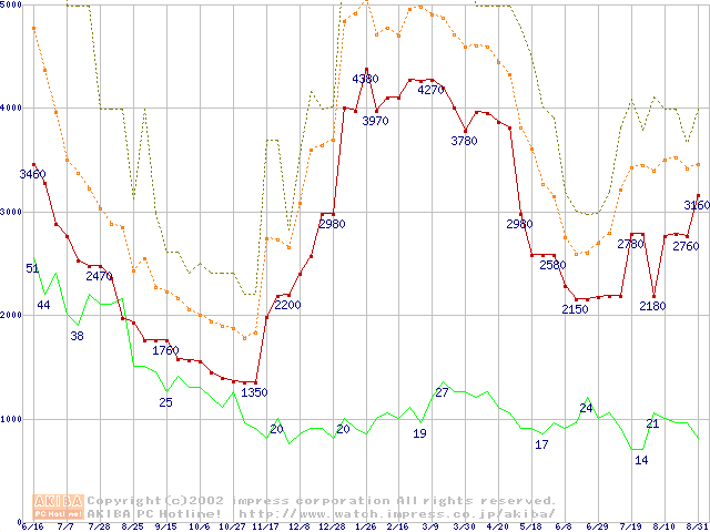 メモリ主要製品(最安値5千円未満)の最安値推移