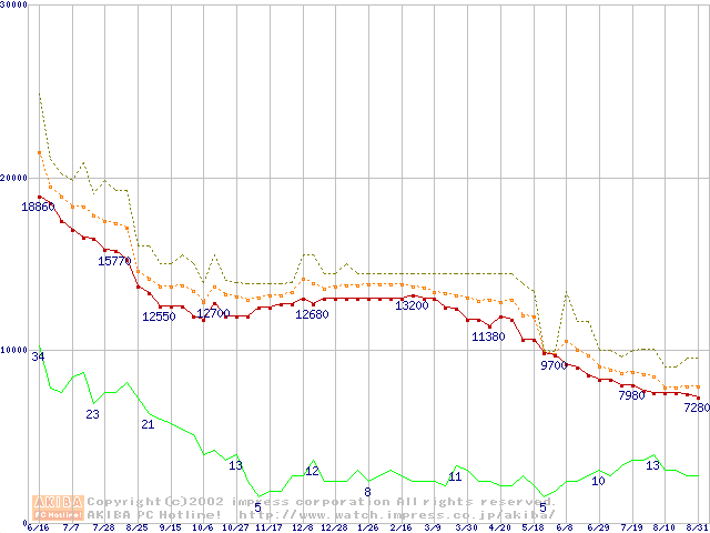 Socket A (Thunderbird,PGA,FSB 266MHz,L2 256KB)の最安値推移