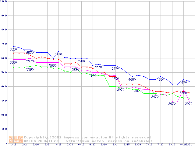 | [↓次グラフ]: | Socket A (Spitfire,PGA,FSB 200MHz,L2 64KB,1.4V)の最安値推移 |