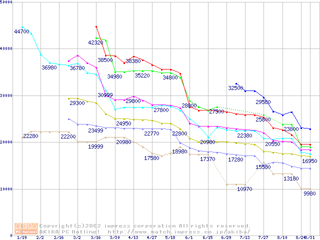 | [↓次グラフ]: | Socket A (Palomino,PGA,FSB 266MHz,L2 256KB)の最安値推移 |