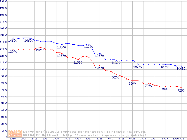 | [↓次グラフ]: | Socket A (Thunderbird,PGA,FSB 200MHz,L2 256KB)の最安値推移 |
