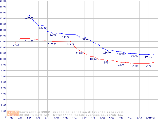 | [↑前グラフ]: | DiamondMax D540X (5400rpm,UltraATA/133,40GB/Platter)の最安値推移 |