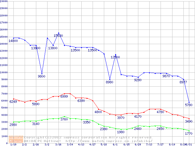 | [↓次グラフ]: | PC100 SDRAM DIMM CasLatency=2 ECC対応の最安値推移 |
