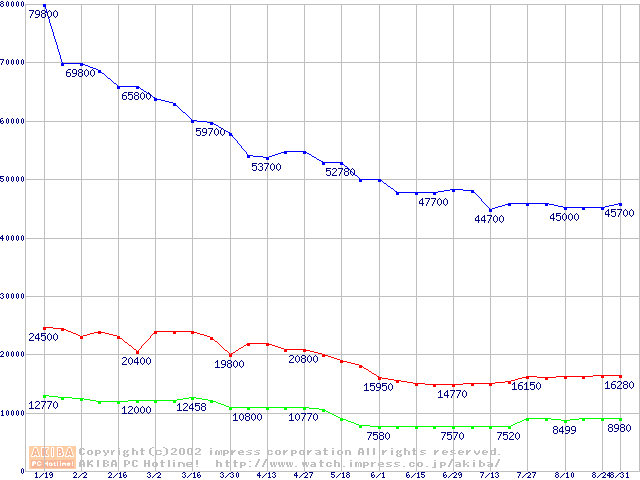 | [↓次グラフ]: | PC2100(DDR266) DDR SDRAM DIMM(CL 2.0) ECC対応 Registeredタイプの最安値推移 |