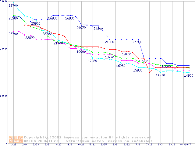 | [↑前グラフ]: | 2.5インチHDD 30GB~40GB未満(9.5mm厚)の最安値推移 |