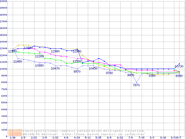| [↑前グラフ]: | HDD 40GB~50GB未満(5400rpmクラス)の最安値推移 |