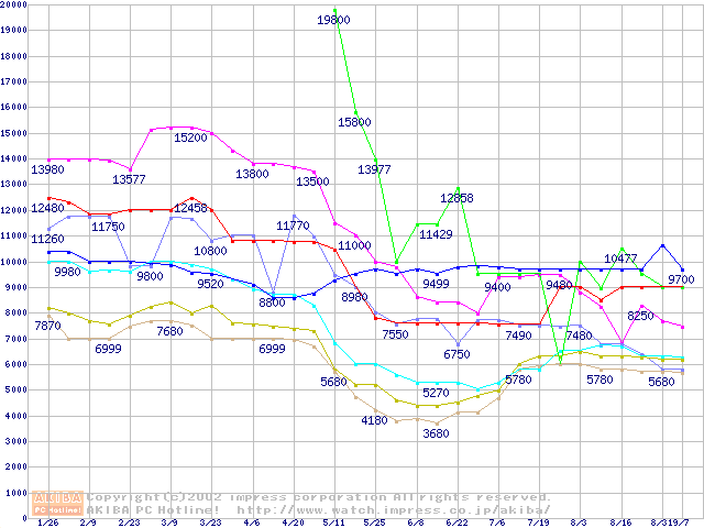 メモリ主要製品(最安値5千円~1万円未満)の最安値推移