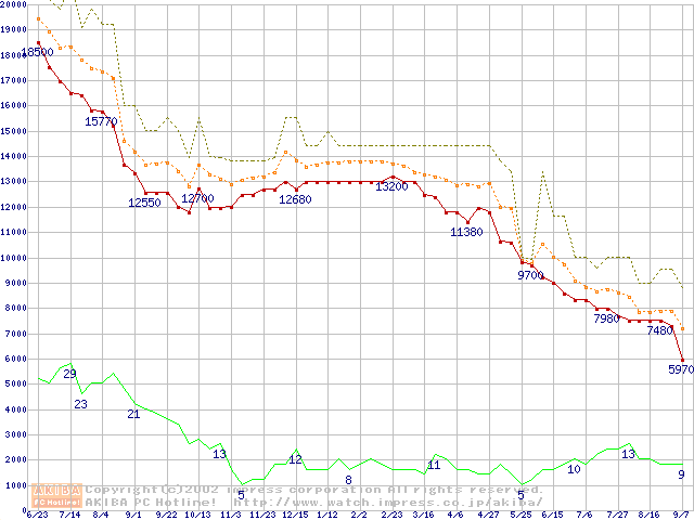 Socket A (Thunderbird,PGA,FSB 266MHz,L2 256KB)の最安値推移