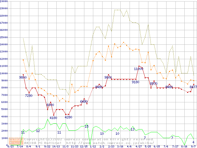 PC133 SDRAM DIMM CasLatency=3 ECC対応 Registeredタイプの最安値推移