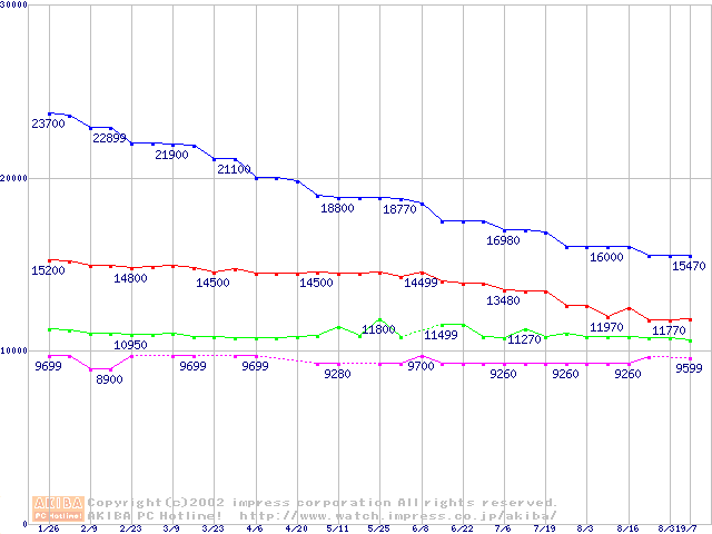 | [↑前グラフ]: | MKシリーズ (9.5mm,4200rpm,2MB,流体軸受け)の最安値推移 |
