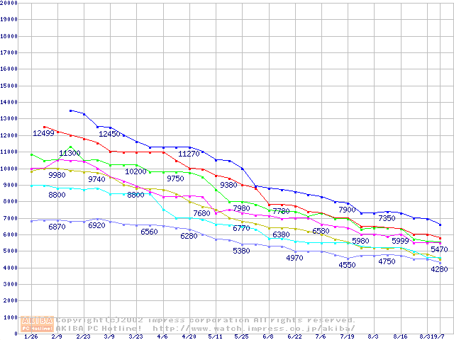 | [↓次グラフ]: | Socket A (Spitfire,PGA,FSB 200MHz,L2 64KB)の最安値推移 |