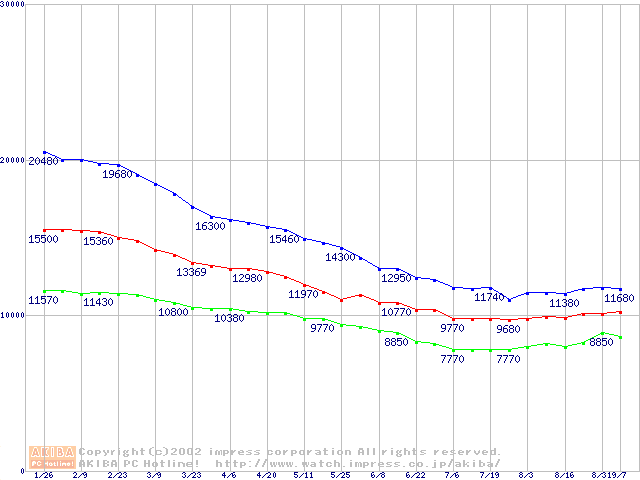 | [↑前グラフ]: | DiamondMax Plus 8 (7200rpm,UltraATA/133,流体軸受)の最安値推移 |