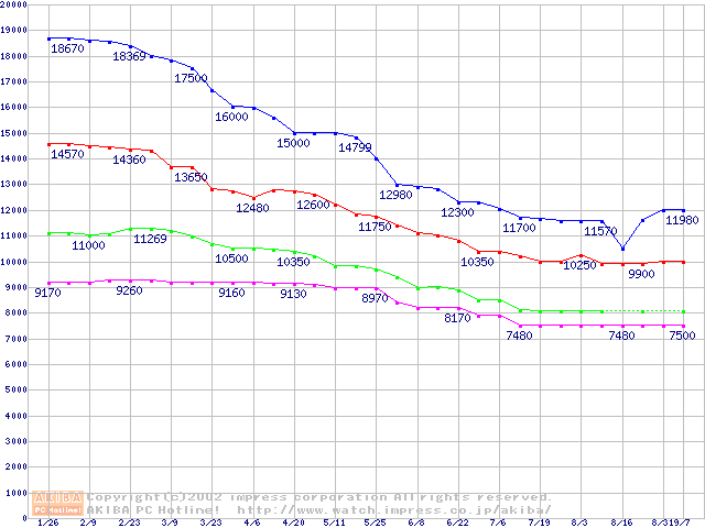 | [↑前グラフ]: | DiamondMax Plus D740X (7200rpm,UltraATA/133,40GB/Platter,流体軸受)の最安値推移 |