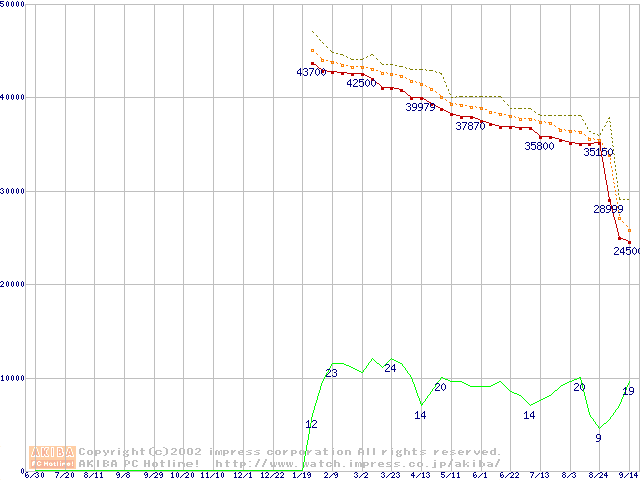 Socket 370 (FC-PGA2,FSB 133MHz,L2 512KB)の最安値推移