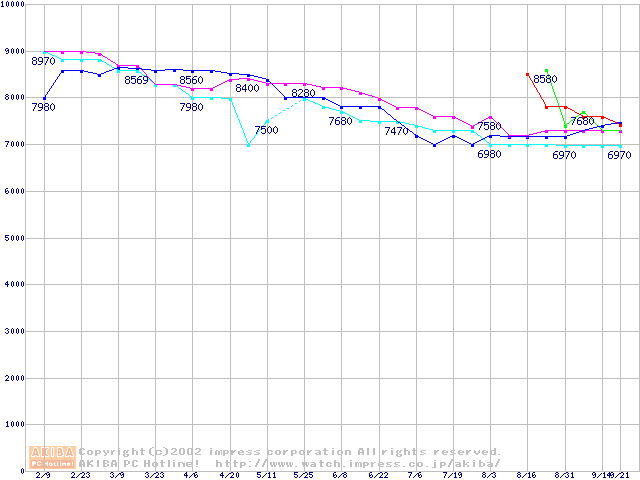 | [↑前グラフ]: | HDD 10GB~20GB未満(5400rpmクラス)の最安値推移 |