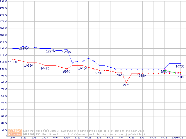 | [↑前グラフ]: | HDD 40GB~50GB未満(5400rpmクラス)の最安値推移 |