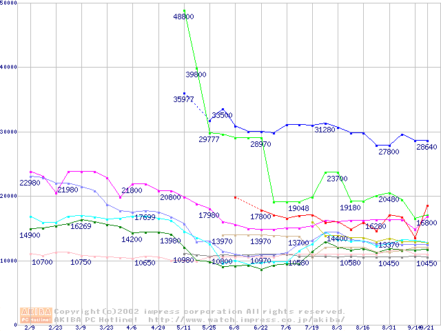 メモリ主要製品(最安値1万円以上)の最安値推移