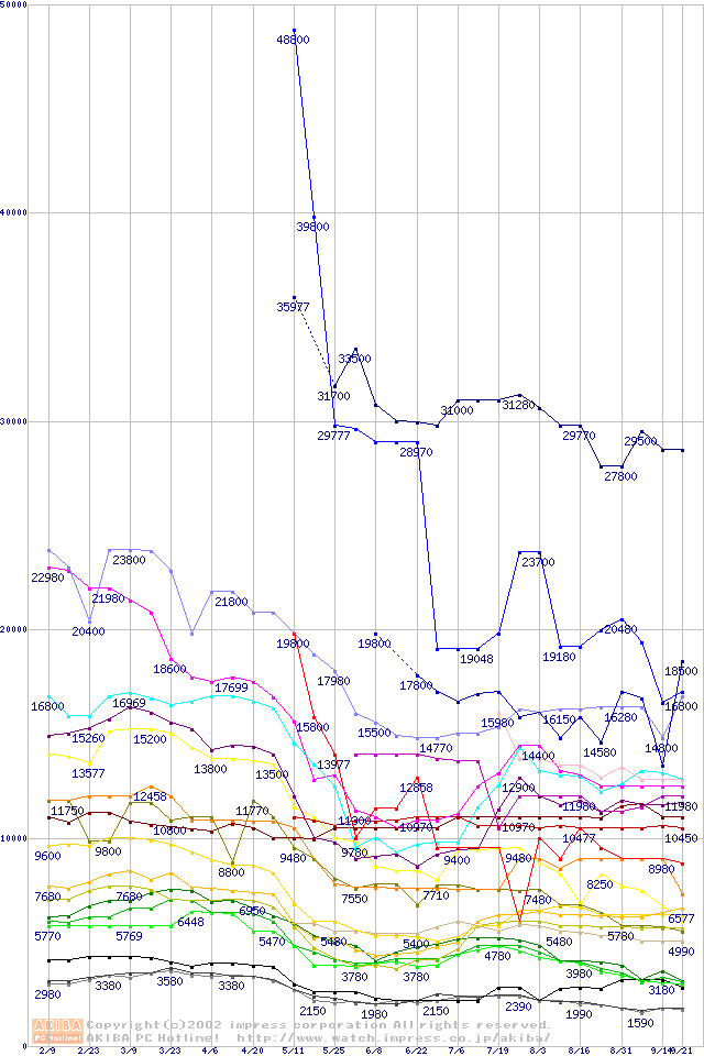 メモリ主要製品(最安値1万円以上)の最安値推移