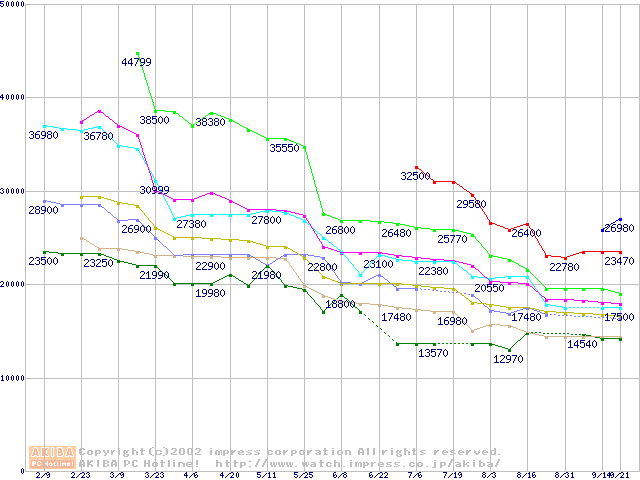 Socket A (Palomino,PGA,FSB 200MHz,L2 256KB)の最安値推移