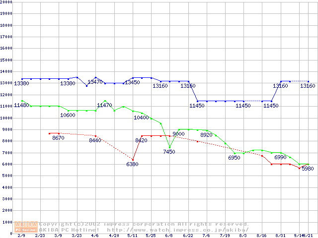 | [↑前グラフ]: | Socket A (Thunderbird,PGA,FSB 266MHz,L2 256KB)の最安値推移 |