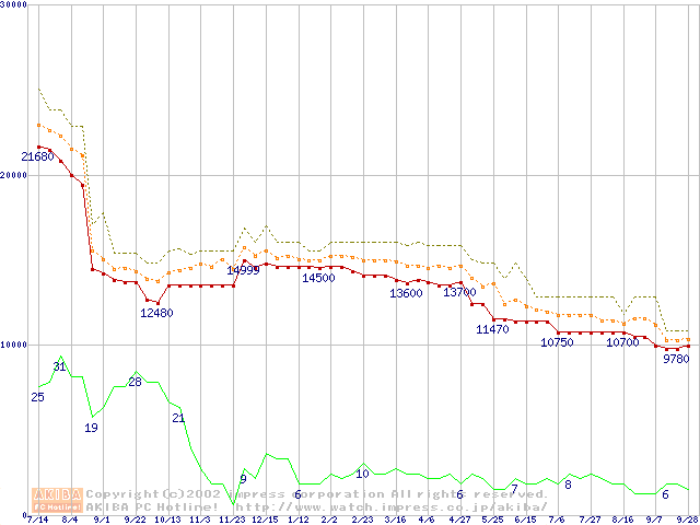 Socket A (Thunderbird,PGA,FSB 266MHz,L2 256KB)の最安値推移