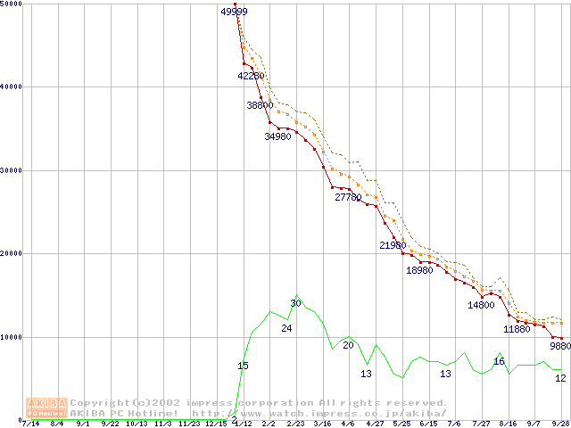 Socket A (Palomino,OPGA,FSB 266MHz,L2 256KB)の最安値推移