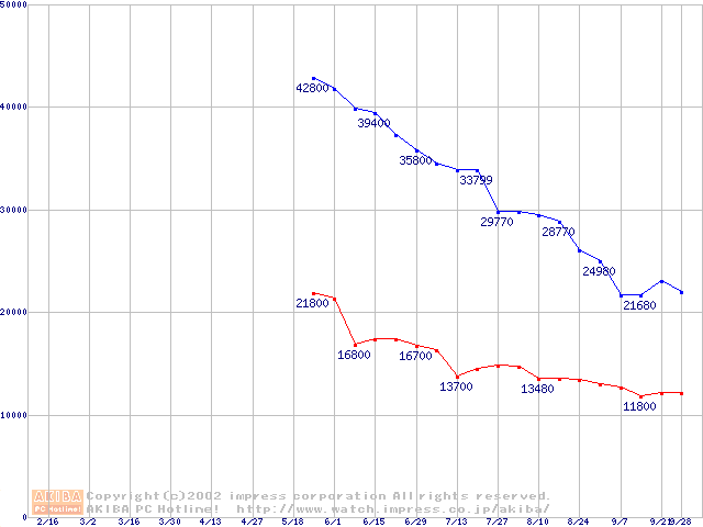 | [↑前グラフ]: | Travelstar 60GH (12.5mm,5400rpm,UltraATA/100,2MB,流体軸受,15GB/Platter)の最安値推移 |
