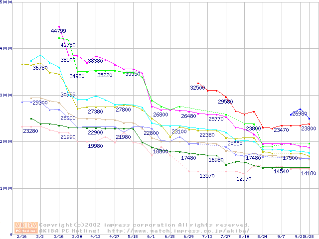 Socket A (Palomino,PGA,FSB 200MHz,L2 256KB)の最安値推移