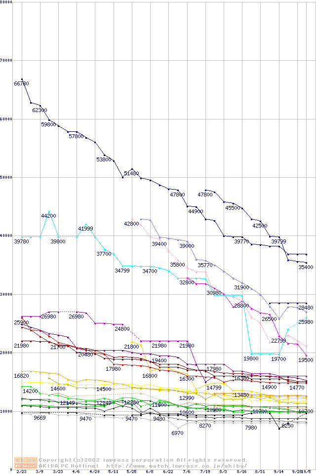 2.5インチHDD主要製品(最安値1万円未満)の最安値推移