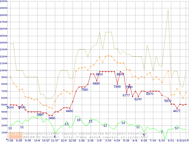 PC133 SDRAM DIMM CasLatency=3 ECC対応の最安値推移