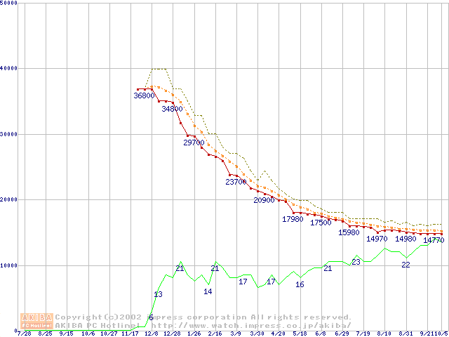 Travelstar 40GN (9.5mm,4200rpm,UltraATA/100,2MB,流体軸受,20GB/Platter)の最安値推移