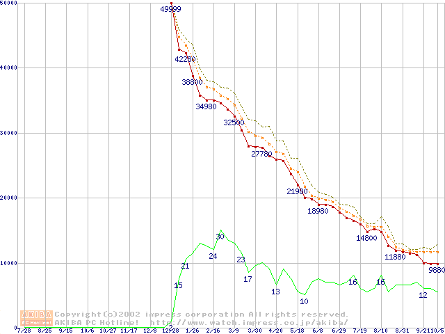 Socket A (Palomino,OPGA,FSB 266MHz,L2 256KB)の最安値推移