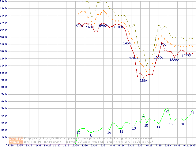 メモリ主要製品(最安値1万円以上)の最安値推移