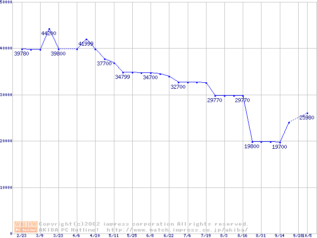 | [↑前グラフ]: | Travelstar 60GH (12.5mm,5400rpm,UltraATA/100,2MB,流体軸受,15GB/Platter)の最安値推移 |