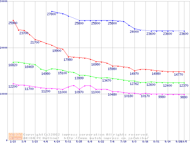 | [↑前グラフ]: | Travelstar 40GNX (9.5mm,5400rpm,UltraATA/100,8MB,流体軸受,20GB/Platter)の最安値推移 |