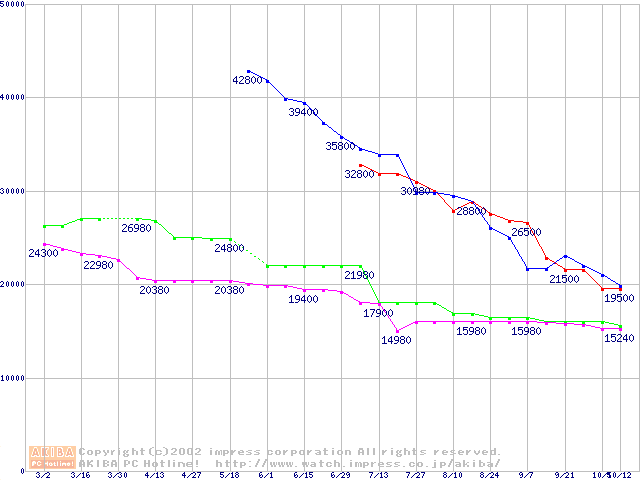 | [↑前グラフ]: | 2.5インチHDD主要製品(最安値1万円~1万5千円未満)の最安値推移 |
