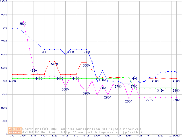 | [↑前グラフ]: | Socket A (Spitfire,PGA,FSB 200MHz,L2 64KB,1.4V)の最安値推移 |