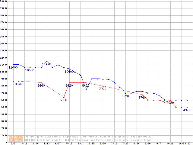 | Socket A (PGA,FSB 200MHz,L2 256KB,Thunderbird)の最安値推移 |
