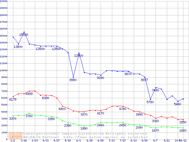 | [↓次グラフ]: | PC100 SDRAM DIMM CasLatency=2 ECC対応の最安値推移 |