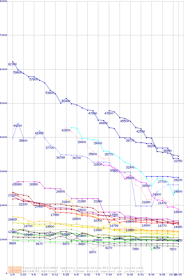 2.5インチHDD主要製品(最安値1万円未満)の最安値推移