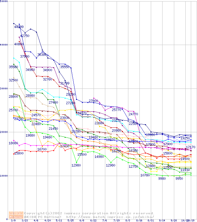 CPU主要製品(最安値1万円~2万円未満)の最安値推移