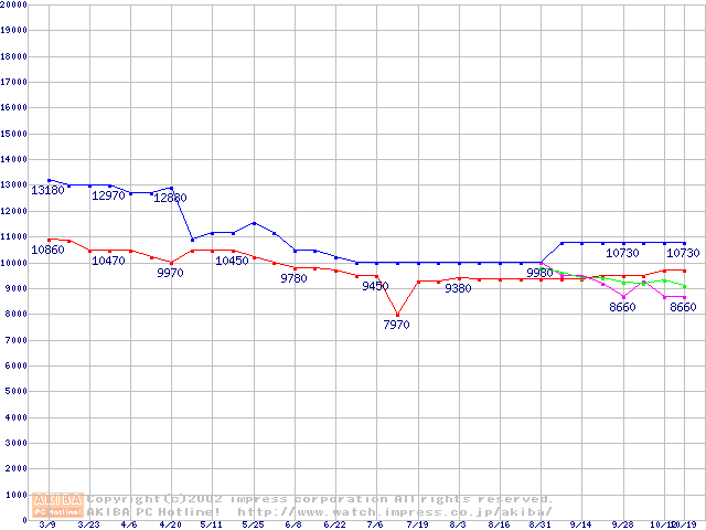 | [↑前グラフ]: | HDD 40GB~50GB未満(5400rpmクラス)の最安値推移 |