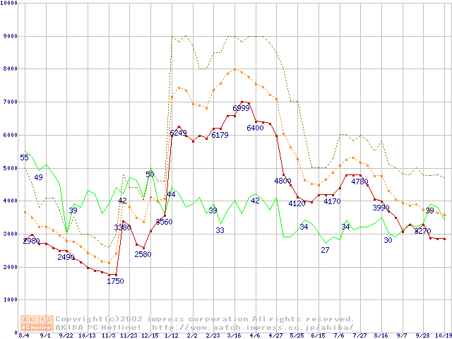 PC100 SDRAM DIMM CasLatency=2の最安値推移