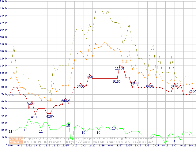 PC133 SDRAM DIMM CasLatency=3 ECC対応 Registeredタイプの最安値推移