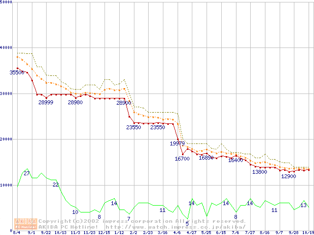 Socket 370 (FC-PGA2,FSB 133MHz,L2 256KB)の最安値推移